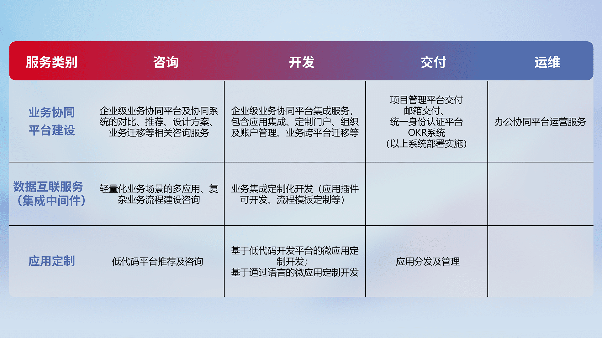 针对钉钉、、、企微、、、、IDaas等平台级产品提供产品的规划、、、方案、、、交付、、、、定制化开发等服务,,,实现如统一协同办公、、、、智能客户服务、、混合会议管理、、、、智能数据查询、、等业务场景,,实现数字化转型。。